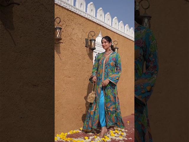 Albeli: where luxury meets contemporary allure. This collection showcases a satin spaghetti top with palazzo bottoms, layered under an ethereal organza jacket adorned with intricate leaf patches and silver piping, making each piece a true work of art.